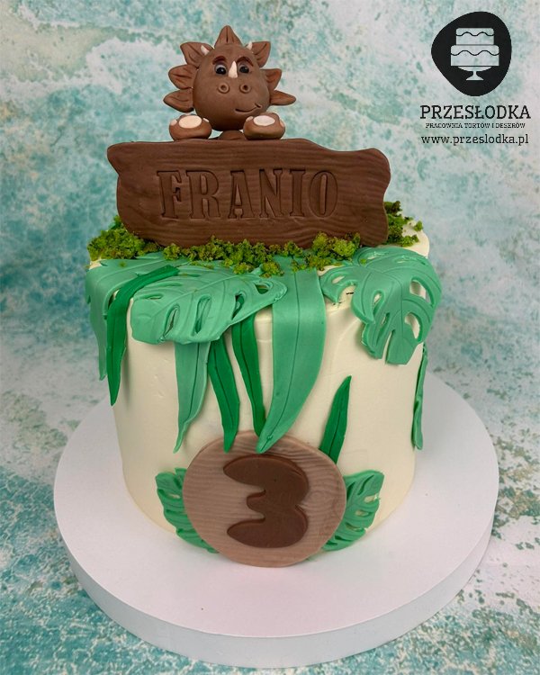 Tort z dinozaurem Triceratopsem w kolorze brązowym - figurkę jadalną, ręcznie lepioną z masy cukrowej. Torty Piaseczno, Warszawa.