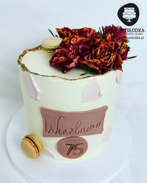 Tort urodzinowy dla kobiety z dekoracją z kwiatów naturalnych i makaroników. Tort na urodziny lub całkowicie bez okazji. Tutaj z dedykowaną etykietą wieku i imieniem. Torty Piaseczno, Warszawa.