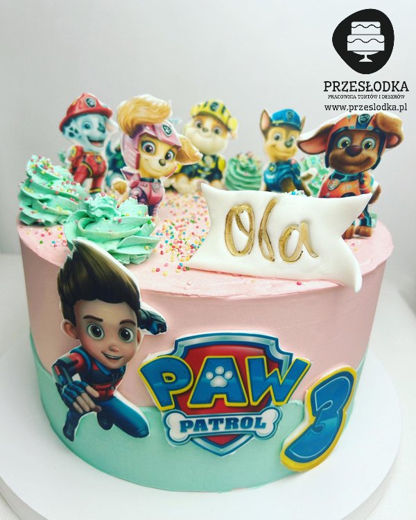 Różowo-zielony tort z Ryderem, Marshallem, Skye, Everestem, Rubblem, Chasem i Zumą. Tort idealny dla fanki lub fana animowanego serialu dla dzieci. Torty Piaseczno, Warszawa.