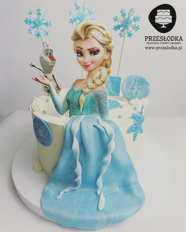 Tort dla fanów Frozen. Sukienka wykonana jest z jadalnej masy cukrowej 3d, natomiast góra Elsy to jadalny wydruk na masie cukrowej. Torty Piaseczno, Warszawa.