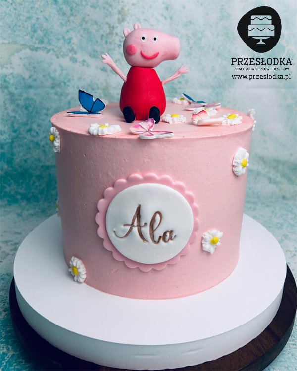 Tort z ręcznie lepioną figurką Świnki Peppy. Figurka w całości jadalna z masy cukrowej. Torty Piaseczno, Warszawa.