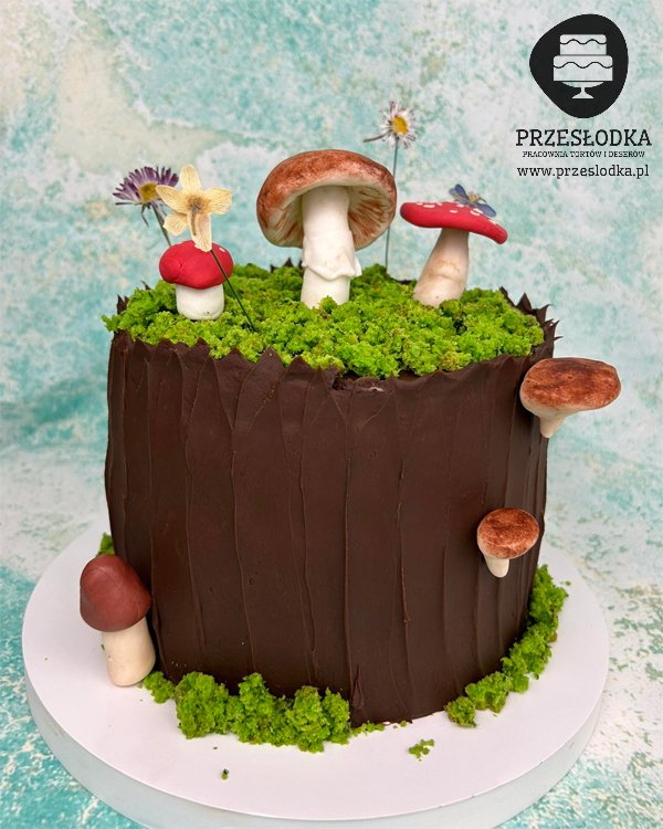 Tort o kształcie pnia drzewa, na którym rośnie mech oraz grzyby. Wszystko wykonane ręcznie z jadalnej masy cukrowej.