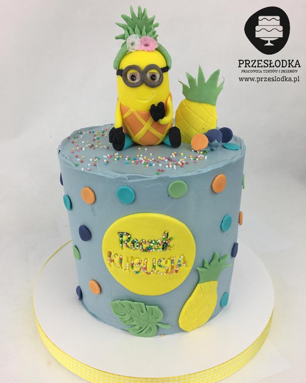 Tort z motywem z filmu animowanego Minionki z masy cukrowej jednego z bohaterów. Minonki mówią językiem Miniońskim, niepodobnym do żadnego innego, ale kilka słów zostało zaczerpnięte z języka angielskiego np. w reklamie filmu Minionki jeden z minionków wypowiada słowo przypominające papaja. Tutaj ananas. Torty Piaseczno, Warszawa.