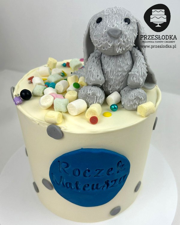Tort dla najmłodszych z ręcznie robioną figurką szarego króliczka.