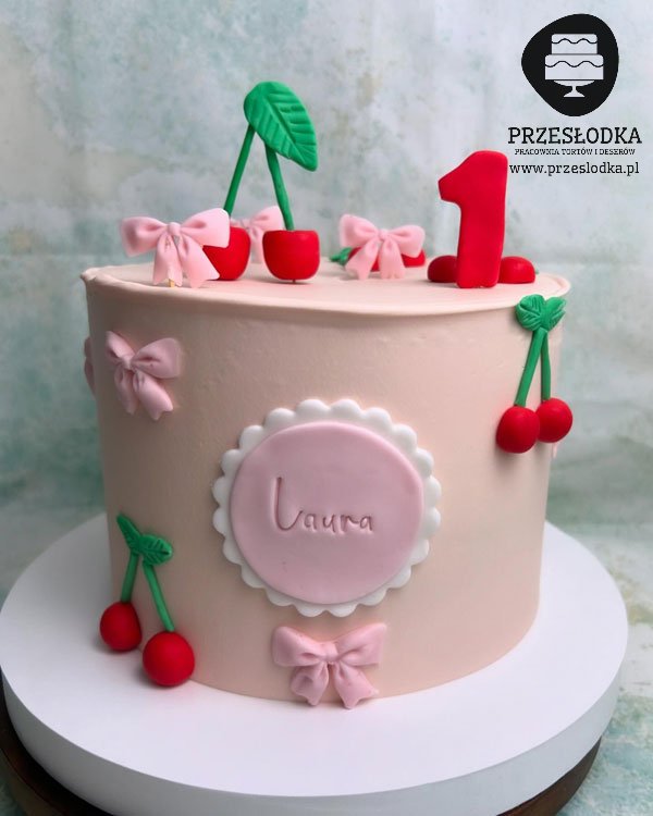 Tort na roczek z wisienkami na torcie. Wiśnie z jadalnej masy cukrowej ręcznie robione - torty Piaseczno, Warszawa.