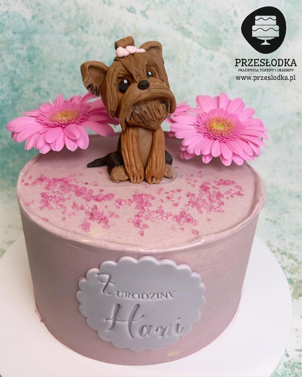Tort z ręcznie lepioną figurką pieska rasy York. W całości jadalna. Do ozdoby kwiaty naturalne. Torty Piaseczno, Warszawa.