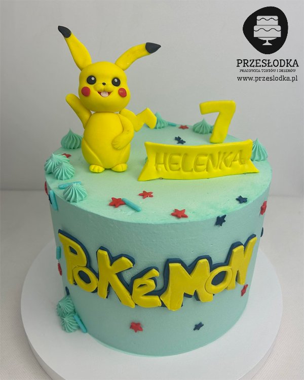 Tort urodzinowy z bohaterem Pokemonów - Pikachu. Na torcie lepiona ręcznie figurka z masy cukrowej oraz napis Pokemon. Torty Piaseczno, Warszawa.