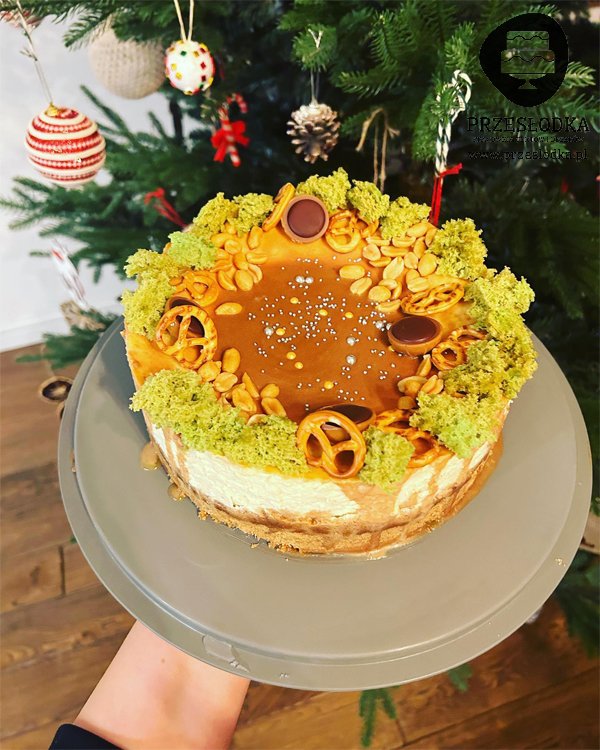 Pyszny sernik z polewą karmelową i orzechami.