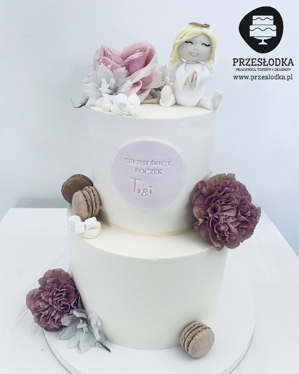 Tort piętrowy na chrzciny dla dziewczynki przyozdobiony naturalnymi kwiatami i słodyczami, a na górze wykonana ręcznie i w całości jadalna figurka aniołka z masy cukrowej - torty Piaseczno, Warszawa.