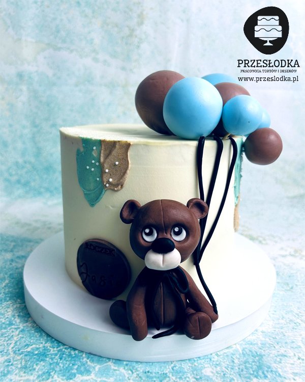 Tort z ręcznie robioną figurką misia, trzymającego baloniki. Torty Piaseczno, Warszawa.