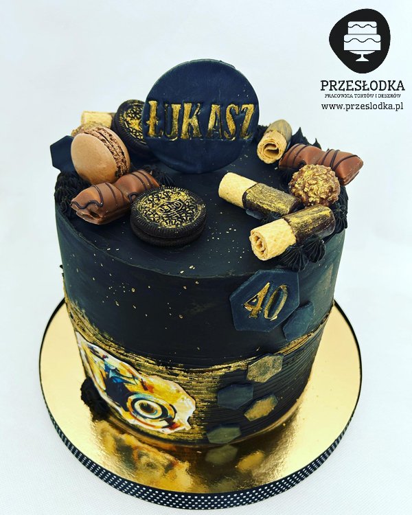 Czarno-złoty tort dla mężczyzny lubiącego klasykę i słodycze. Ozdoby m.in. z Oreo, Kinder Bueno i makaroników.