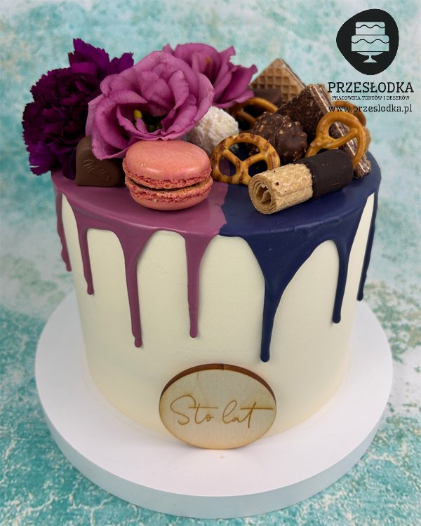 Tort z tynkiem z białej czekolady i naturalnego masła, z ciemnym lub jasnym biszkoptem, przedkładany aż trzema smakami (można je wybrać samemu z naszej oferty smaków tortów w cenniku w menu). Zamów podobny tort lub według swojego projektu.