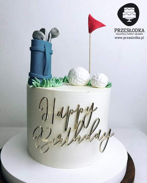 Biały tort z trawą na górze oraz dołkiem. Ręcznie robione kije golfowe w torbie oraz piłeczki golfowe. Idealny tort dla człowieka kochającego tę dyscyplinę sportu. Torty Piaseczno, Warszawa.