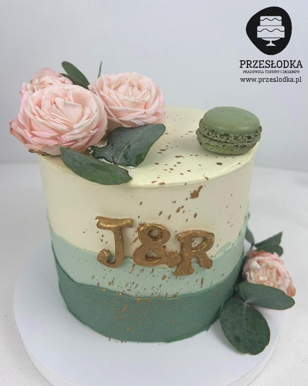 Tort zielono-kremowy z dekoracją z naturalnych różowych róż oraz zielonego makaronika. Do tego złoty napis początków imion pary. Idealny tort na urodziny lub rocznicę. Torty Piaseczno, Warszawa.