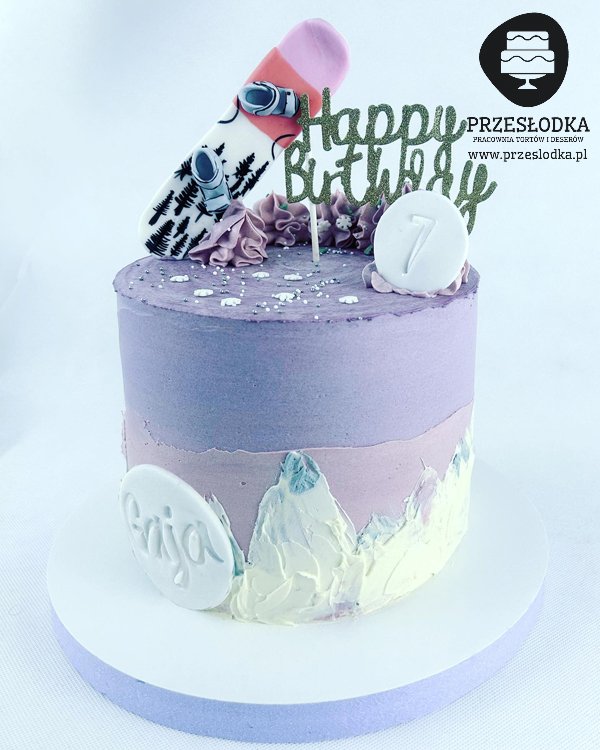 Tort z zarysem gór, deską snowboardową i topperem urodzinowym. W kolorach raczej dla kobiety lub młodej dziewczyny, która kocha jeździć na desce. Torty Piaseczno, Warszawa.