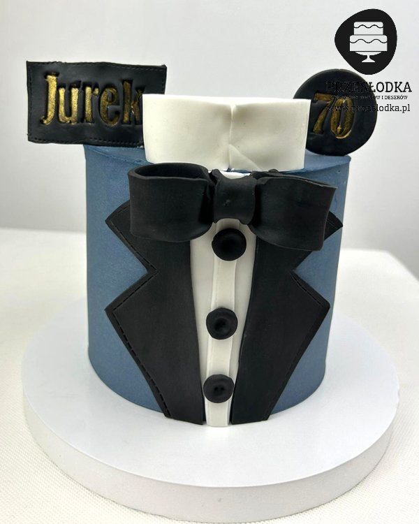 Tort dla eleganckiego mężczyzny w formie garnituru z muszką - w całości jadalny, lepiony ręcznie z masy cukrowej. Torty Piaseczno, Warszawa.