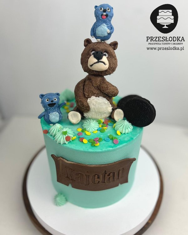Tort ze smutnym misiem gryzli, którego znów męczą małe lemingi. Zielony tort udekorowany Oreo i słodką posypką. Torty Piaseczno, Warszawa.