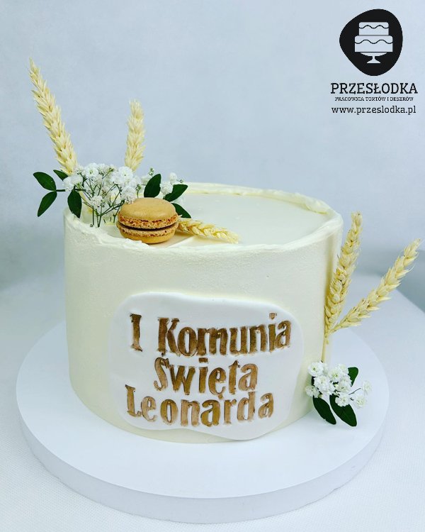 Tort dla dziecka na Komunię Świętą przyozdobiony kłosami zboża, słodkim makaronikiem oraz kwiatkami. Tort z dedykowaną tabliczką z masy cukrowej. Torty Piaseczno, Warszawa.