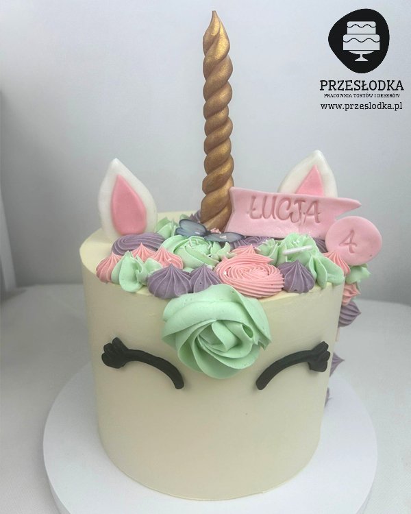 Wielokolorowy tort jednorożec ze zdobieniami jadalnymi i złotym rogiem. Torty Piaseczno, Warszawa.