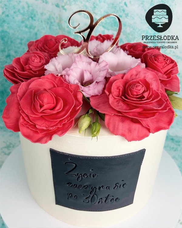 Elegancki tort dla kobiety z ozdobami z jadalnej masy cukrowej. Kwiaty wykonane ręcznie, a wyglądające na prawdziwe i naturalne. Torty Piaseczno, Warszawa.