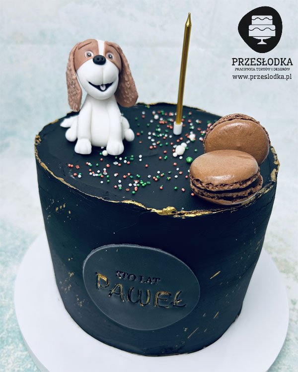 Tort w kolorze czarnym ozdobiony makaronikami oraz ręcznie lepioną i w całości jadalną figurką psa - torty Piaseczno, Warszawa.