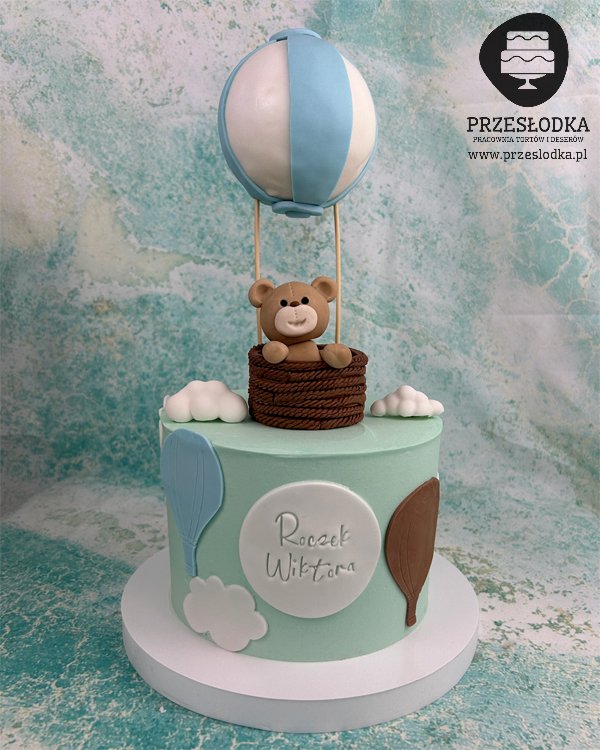 Zielony tort z motywem lecącego balonu. W koszu siedzi mały miś. Tort na roczek dla dziecka. Torty Piaseczno, Warszawa.