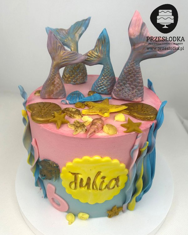 Kolorowy tort z licznymi ozdobami morskimi. Są tu rozgwiazdy, ślimaki, wodorosty oraz motyw główny - rybie ogony zanurzone w torcie. Torty Piaseczno, Warszawa.
