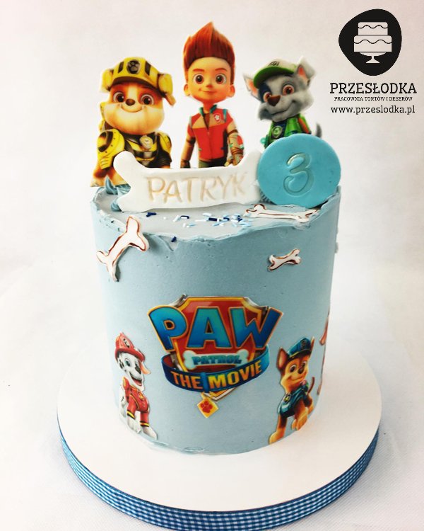 Tort dla dziecka, fana serialu Psi Patrol. Na torcie trzy wydruki - Rubble, Ryder i Rocky. Tort urodzinowy dla dziewczynki lub chłopca. Torty Piaseczno, Warszawa.