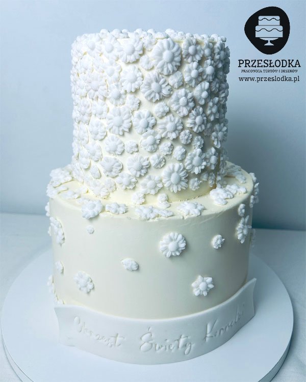Tort piętrowy na chrzciny przyozdobiony kwiatkami z masy cukrowej - torty Piaseczno, Warszawa.
