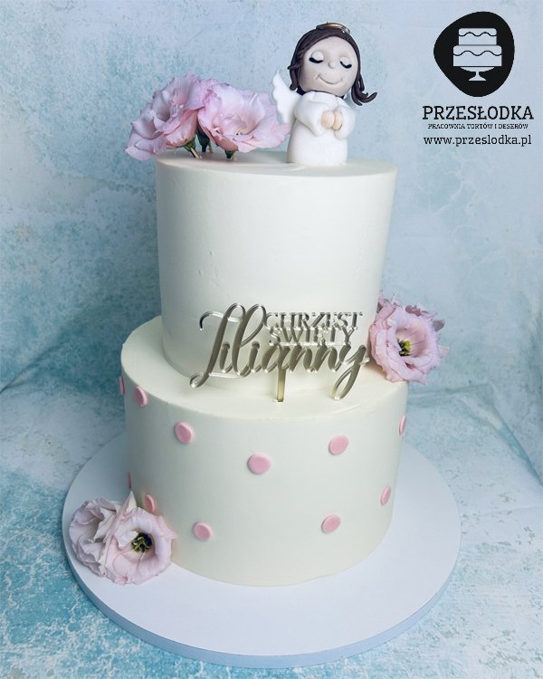 Tort na chrzciny piętrowy z ręcznie robioną figurką aniołka oraz ozdobiony naturalnymi kwiatami. Torty Piaseczno, Warszawa.