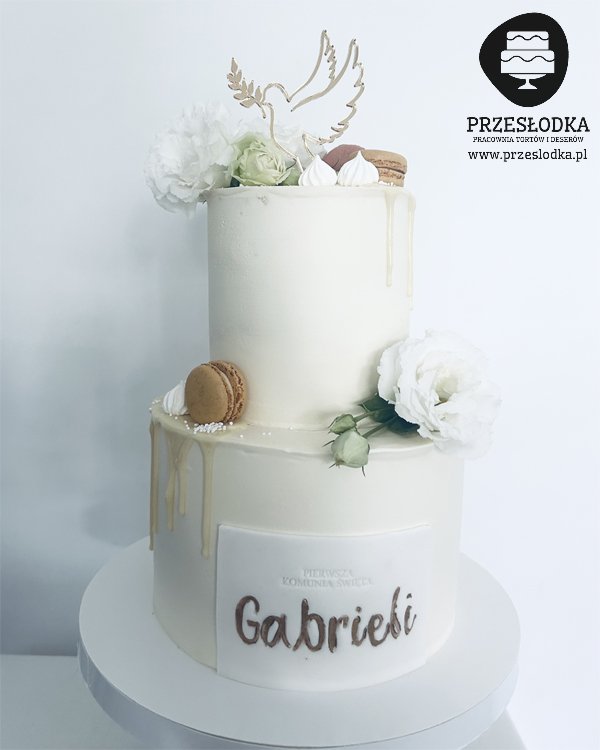 Tort piętrowy na pierwszą komunię świętą dla dziewczynki z gołębiem - torty Piaseczno, Warszawa.