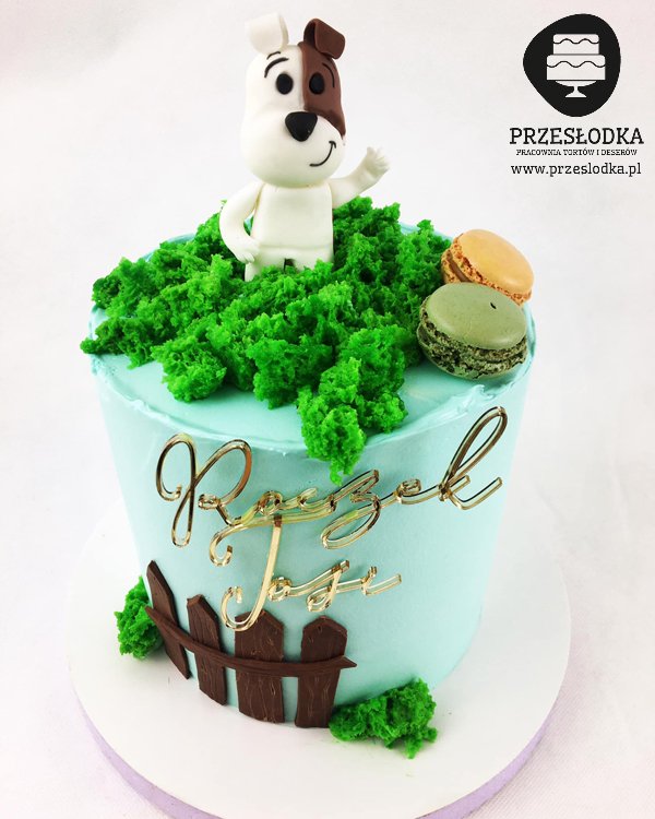 Tort przyzdobiony słodkimi makaronikami. Figurka Reksia ręcznie robiona, w całości jadalna. Nie wszystkie dzieci znają Reksia, czyli popularną bajkę z lat 80-tych ubiegłego stulecia, kiedy to zawsze leciała na Dobranockę. Torty Piaseczno, Warszawa.