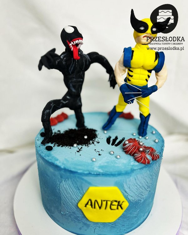 Wolverine to superbohater pochodzący z Kanady. Mutant, którego cechuje zdolność szybkiej regeneracji uszkodzonych tkanek ciała i kostne pazury chowane w przedramionach obu rąk. Jego pseudonim tłumaczy się na język polski jako rosomak, co wiąże się z jego dziką naturą. Należał do grup X-Men, The Avengers i Alpha Flight. Na torcie jego figurka oraz Venoma. Torty Piaseczno, Warszawa.