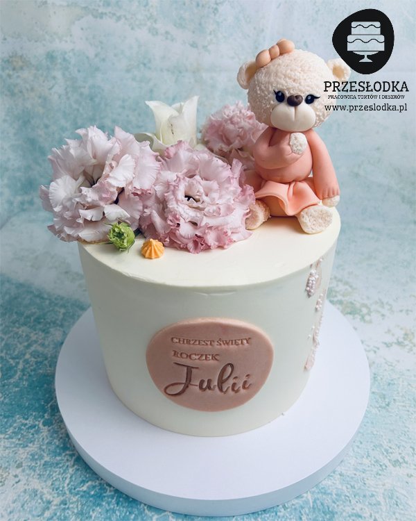 Tort na chrzciny dziecka z ręcznie robioną i w całości jadalną figurką misia. Torty Piaseczno, Warszawa.