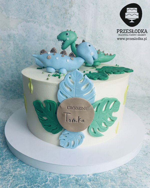Tort dla dziecka z dinozaurami zielonym i niebieskim. Figurki ręcznie robione w całości jadalne. Torty Piaseczno, Warszawa.