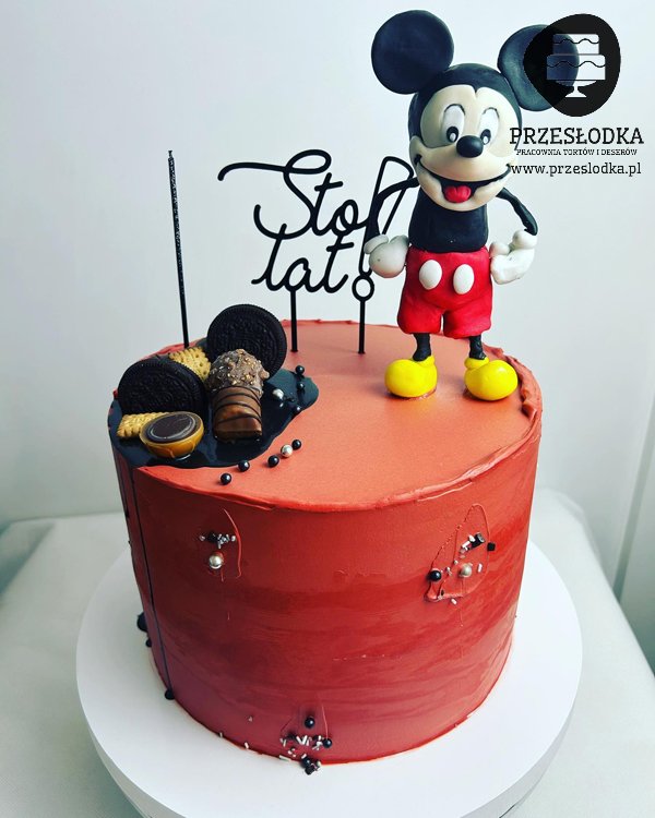 Tort w czerwonym kolorze z figurką Myszki Mickey oraz topperem Sto lat. Na torcie dodatkowo słodkości Toffifee, Oreo i Kinder Bueno. Torty Piaseczno, Warszawa.
