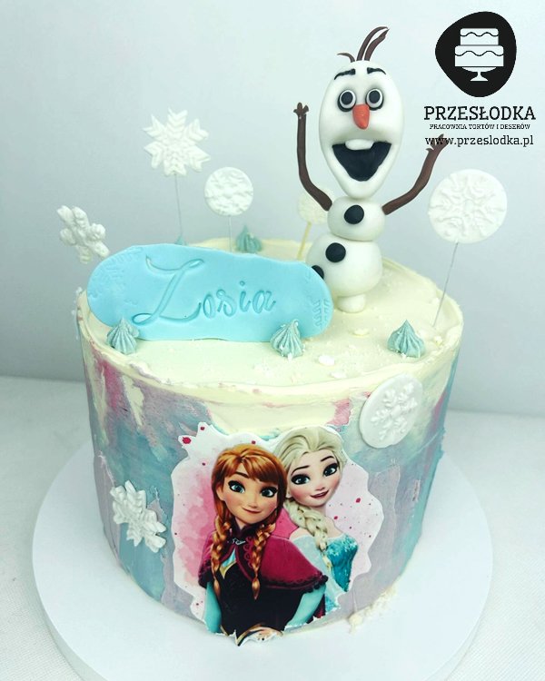 Tort z motywem z filmu Kriana Lodu (Frozen). Na torcie wydruk z masy cukrowej z głównymi bohaterkami - Anną i Elsą, a na górze figurka Olafa i śnieżynki. Torty Piaseczno, Warszawa.