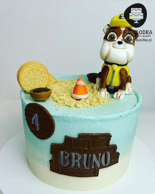 Rubble jest budowniczym i konstruktorem, jeździ spychaczem. W drużynie Psiego Patrolu jest specjalistą do zadań budowniczych. Tort z ręcznie robioną figurką pieska z jadalnej masy cukrowej. Torty Piaseczno, Warszawa.