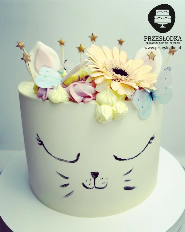 Tort imitujący głowę kotka, udekorowany motylkami i kwiatami. Idealny dla dziewczynki kochającej koty. Tort jest wspaniałą alternatywą dla tradycyjnego tortu z figurką czy wydrukiem. Torty Piaseczno, Warszawa.