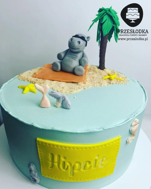 Tort z ręcznie robioną figurką hipopotama z masy cukrowej leżącym na kocyku na plaży z palmą nad jeziorem, w którym pływają rybki. Tort dla grupy przedszkolnej. Torty Piaseczno, Warszawa.