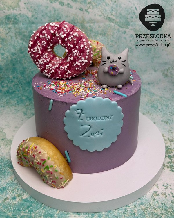 Fioletowy tort ozdobiony pączkami typu donat oraz z ręcznie lepioną figurką kotka Pusheen. Torty Piaseczno, Warszawa.