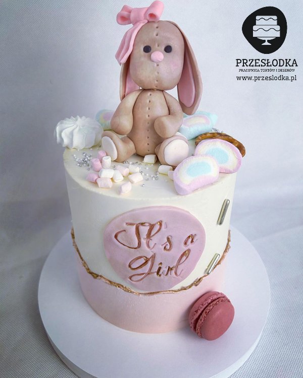 Tort na Baby Shower z ręcznie robioną figurką uroczego królika z piankami oraz napisem It's a girl.
