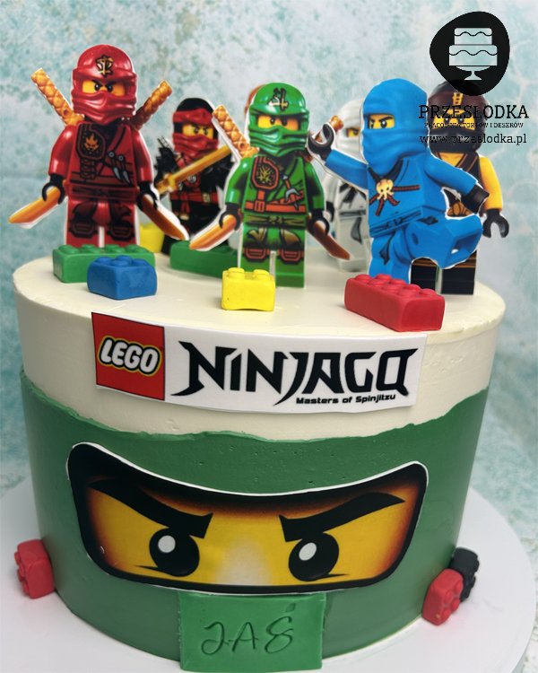 Tort z ludzikami z bajki Lego Ninjago wydrukowanymi na jadalnej masie cukrowej. Torty Piaseczno, Warszawa.