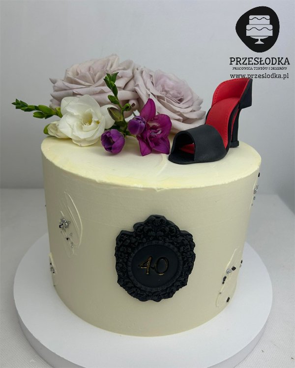 Biały tort dla kobiety udekorowany kwiatami o różnym kolorze oraz z ręcznie lepioną jadalną figurką pantofelka z masy cukrowej. Elegancki tort dla pani. Torty Piaseczno, Warszawa.