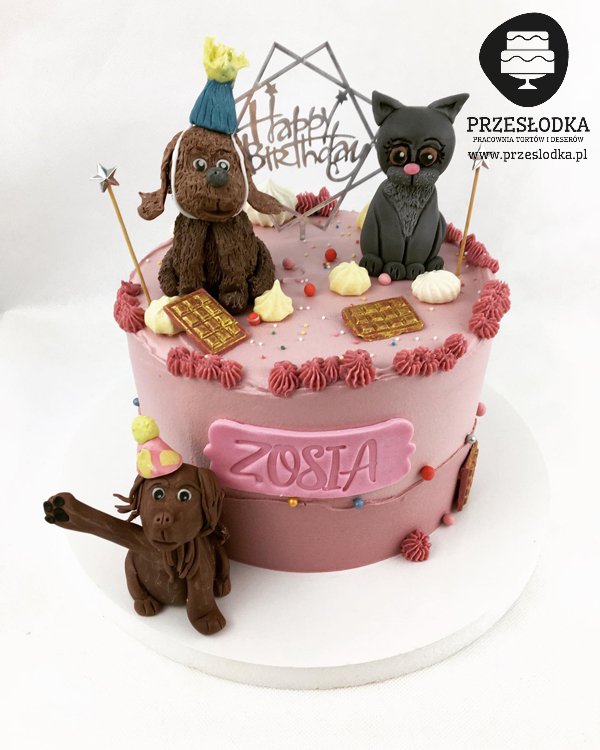 Kto z nas nie ma lub nie miał psa albo kota w domu. Nasi pupile są jak rodzina, która wspólnie z nami świętuje ważne chwile jak urodziny czy imieniny. Figurki psów i kotów na torcie z jadalnej masz cukrowej idealnie pasuj do fana czworonogów. Tutaj różowy tort dla dziewczynki z jej ulubionymi zwierzątkami. Torty Piaseczno, Warszawa.