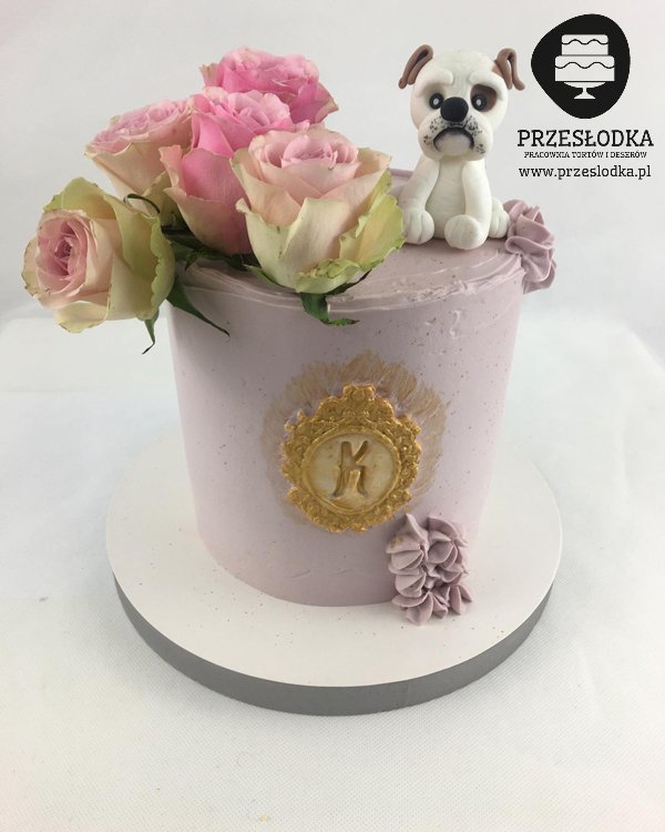 Jasnofioletowy tort z dekoracjami z kwiatów dla kobiety lub dziewczyny, która kocha psy. Pies to najlepszy przyjaciel człowieka, dlatego często motyw psa pojawia się na torcie. Figurka odzwierciedla to co lubimy najbardziej. Tutaj tort dla miłośniczki czworonogów z personalizacją rasy bokser. Torty Piaseczno, Warszawa.