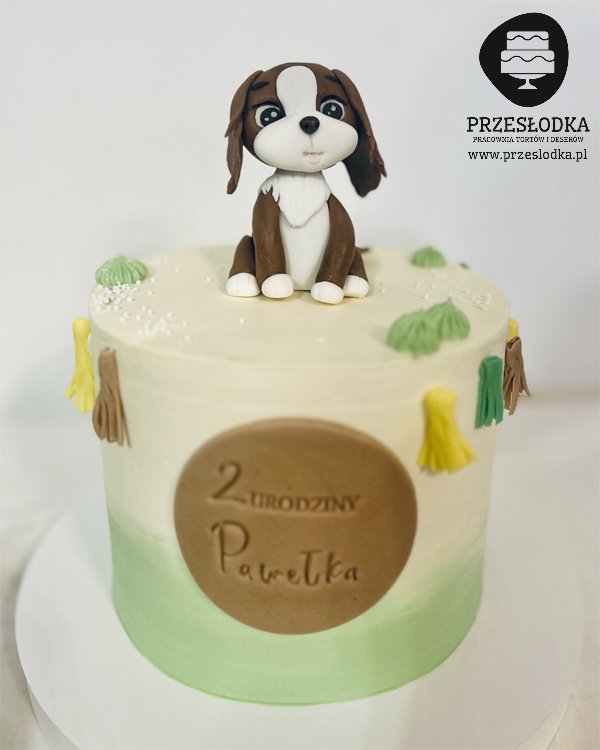 Tort na drugie urodziny chłopca z ręcznie robioną i w całości jadalną figurką psa - torty Piaseczno, Warszawa.
