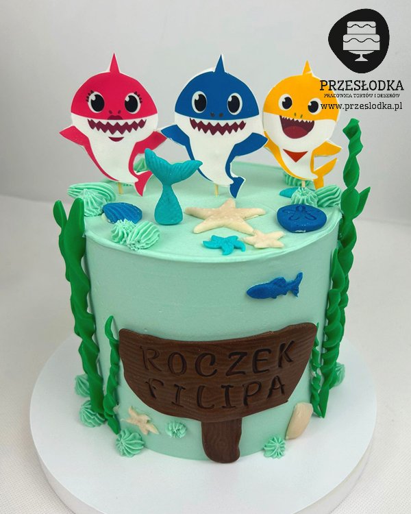 Tort z wydrukami jadalnymi rekinów - Baby Shark.