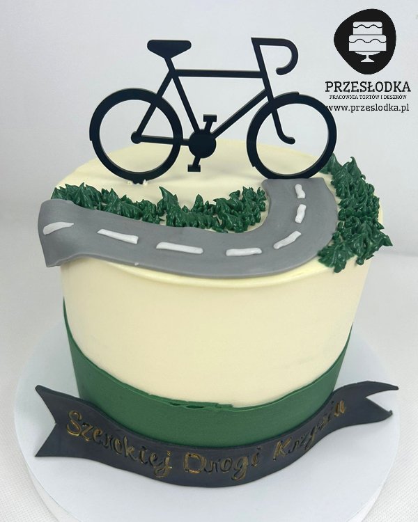 Tort dla fana kolarstwa i wycieczek rowerowych. Na górze droga, a właściwie szosa i topper w kształcie roweru szosowego - tzw. kolarki. Torty Piaseczno, Warszawa.