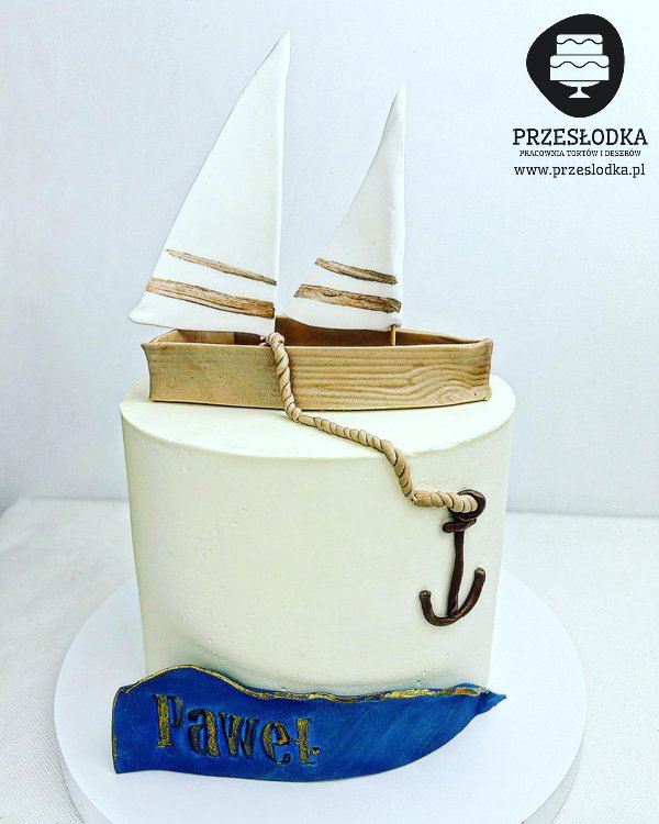 Tort z ręcznie robioną żaglówką z dwoma żaglami i kotwicą. Tort idealny dla kochającego Mazury żeglarza. Torty Piaseczno, Warszawa.